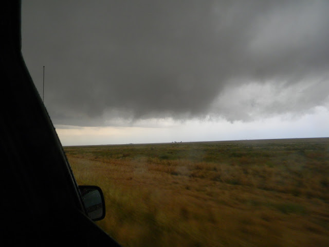 The old wall cloud/mesocyclone occluded and a new meso formed up further to the northeast and spat out a tiny pencil tornado which would be tornado #3. The old meso had put out a multi-vortex bowl which ended up being #2 but I wasn't able to get a good shot of it since it was on the left side of the car.
